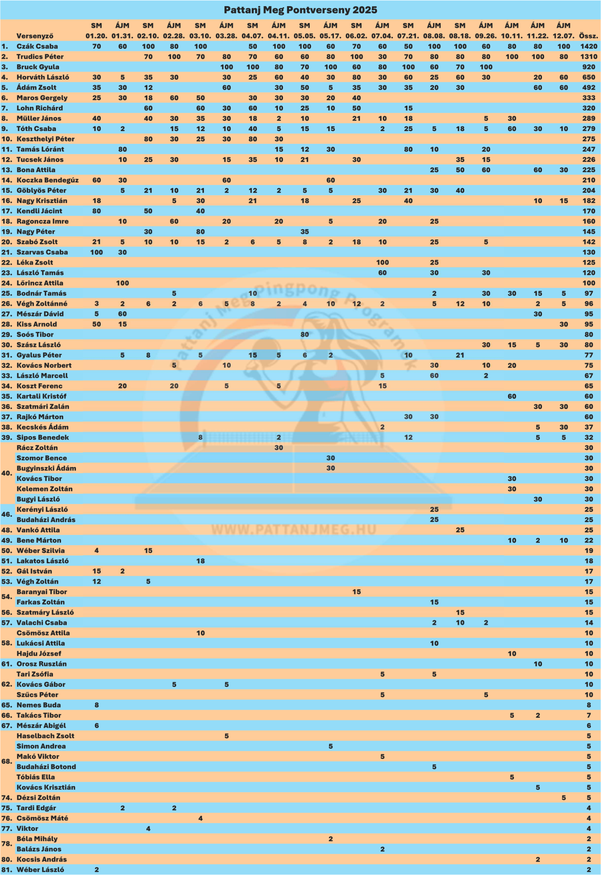 Díjazás: az év végére a legtöbb pontot gyűjtött versenyző elnyeri a „Pattanj Meg Pontverseny Bajnoka 2026” címet és a versenysorozat vándorkupáját, amit a következő év utolsó versenyéig birtokolhat.
